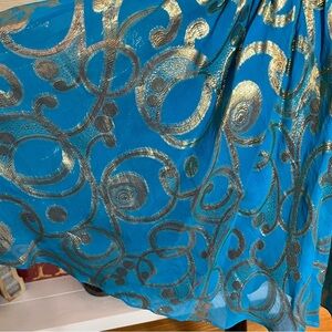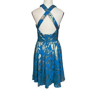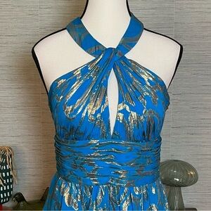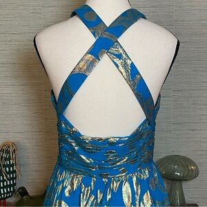 Aidan Mattox Silk Turquoise Blue Gold Dress Sz 8 Keyhole Criss Cross Metallic