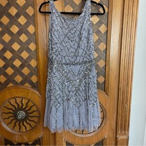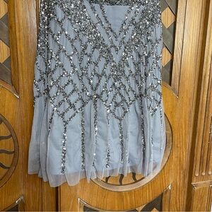 Gorgeous gray sequin mini cocktail party dress. Mesh fabric with silver sequins and beads throughout. Zippers in the back.