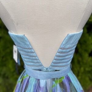 New With Tag Mini strapless belted dress. Size 0. Fit and flare style. With sweetheart neckline and angle toward a banded waist and tulle skirt. Color blue, pink, purple, green. Materials are 100% Silk top, 100% lining Polyester and Skirt lining 100% Acetate. *Couldn’t close zipper all the way because dress is Size 0 and mannequin is 4z Would make a great prom dress.