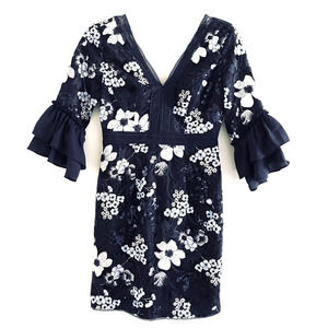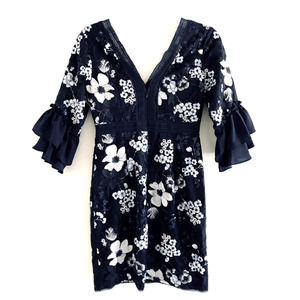Aidan Mattox Women Navy & White Floral Print 3/4 Sleeve V-Neck Mini Dress Size 0