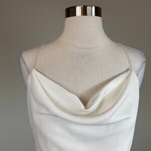 ~ Sleeveless ~ Clear and silver beaded shoulder straps ~ Cowl neckline ~ Backless ~ Shift silhouette ~ Above the knee hemline ~ Concealed side zipper ~ Fully lined ~ Structured polyester/spandex