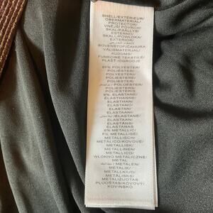 ~ Sleeveless ~ Cut-in shoulders ~ Halter neckline ~ Cutout back ~ Center slit ~ Long Hemline ~ Column silhouette ~ Metallic threading throughout in colors of purple, black, and gold ~ Padded bra cups ~ Concealed back zipper with hook and eye closure ~ Fully lined ~ Stretchable polyester/spandex/metallic