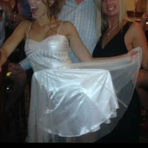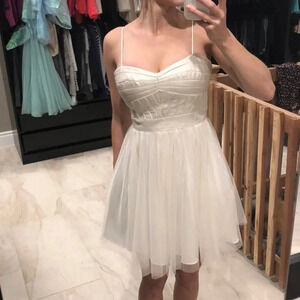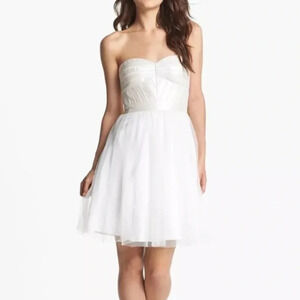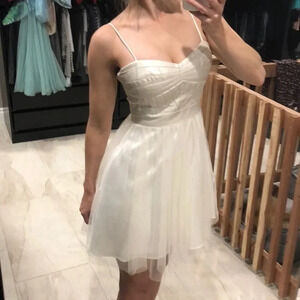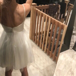 Coated faux-leather bands contour sweetheart neckline and angle toward the waist, adding incandescent shimmer to a fanciful party dress boosted by a voluminous tulle skirt. Best part- pockets! 34.5" L. Bust Across 17”. This is from my personal closet. Straps added and Interior bra was removed. Small hole near a side seem means savings of $200