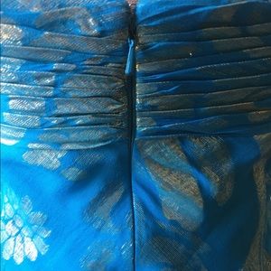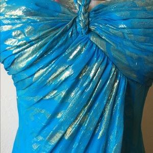 Beautiful long blue dress with gold silk flowers. Perfect for formal occasions