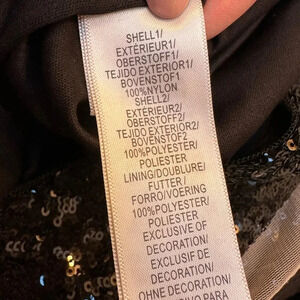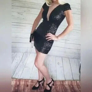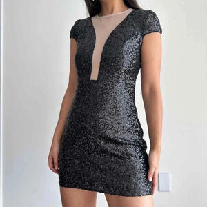 Details: Cap Sleeves, Sequined, Illusion Plunging Inset, Full Back, Back Zipper Closure, Short Hem
