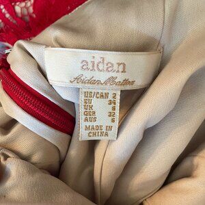This lovely cocktail dress is Aidan by Aidan Mattox features red lace and an illusion nude v-neck. Only worn twice and is in great condition!