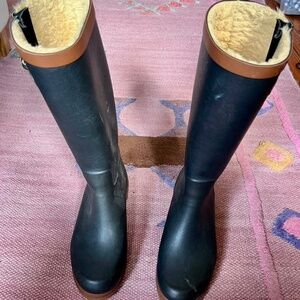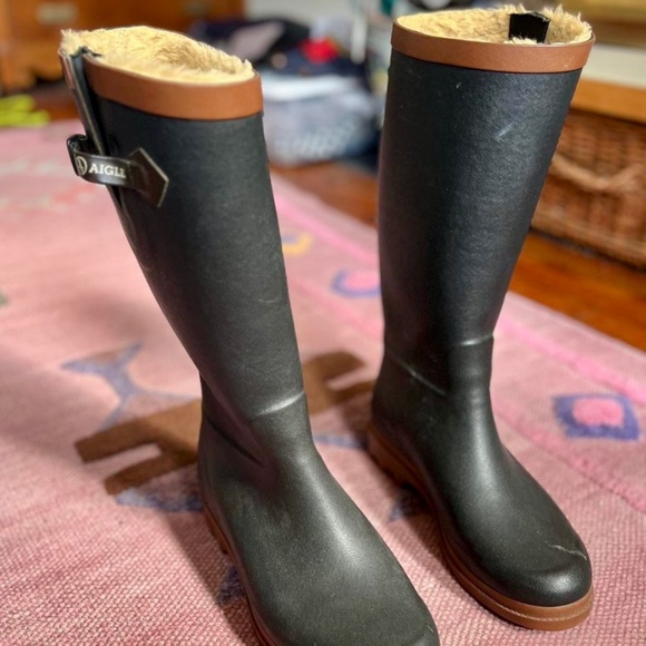 French snow boots by Aigle. Made in France with waterproof rubber. These are a classic, equestrian-inspired silhouette in navy with shearling lining (clean and odor free). Brown detailing at sole and top.