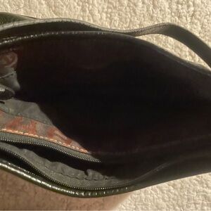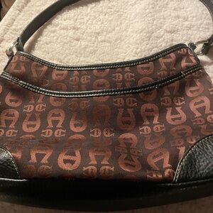 Stylish brown women's shoulder bag with a unique logo pattern. Good pre-loved condition, bag shows light wear on straps. Magnetic snap closure with buckle detail. Center divided zip with inside pocket’s. Bag is 12x8”