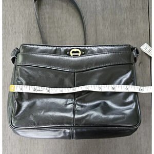 This Etienne Aigner True Vintage crossbody purse is a stylish and functional accessory for any woman. The bag is made of high-quality black leather with a shiny finish and features a rectangular shape with a zip and snap closure. The bag has a medium size, measuring 9 inches in width, 7 inches in height, and 4 inches in depth. The bag has a black leather crossbody strap that can be adjusted to the desired length and features a gold hardware color. There is small wear on logo. The bag also has a purple interior color with logo accents. The bag has inner pockets, outer pockets and inner dividers. It is a true vintage piece that is genuine leather.