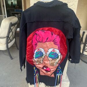 Fun ripped black denim with artsy fun design on the back. Size S/M