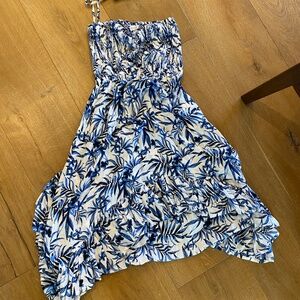 The dress for sale has a blue and white print as seen on the last few photos. The first few pictures are just to show you the design. The dress is not beige and white.
