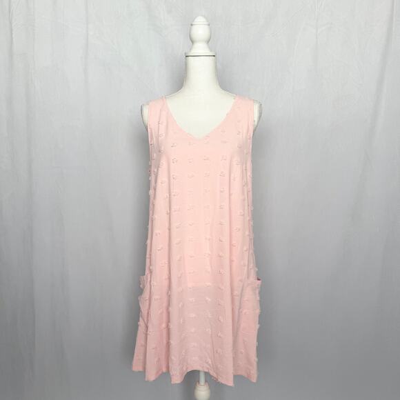 Aimage sleeveless knee-length dress in a soft light pink with textured frayed polka dots. Lightweight and flowy with a relaxed fit that flatters a range of body types. Easy to throw on for warm weather, brunch, travel, or spring/summer layering.