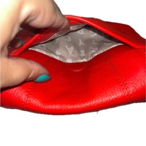 This Aimee Kestenberg crossbody bag showcases a vibrant red hue, crafted from pebbled leather with a curved flap closure. The gold-tone hardware and suede tassel detail add a touch of elegance, making it a standout accessory for any occasion. Still like new used a couple of hours.