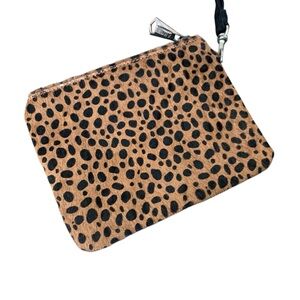 Excellent condition. Zip up. Wristlet strap was removed so add a new fabric strap. Fabric printed interior lining. Awesome to use as a wallet, make up, receipts, etc. Stylish leopard print wristlet clutch. Features a convenient black strap.