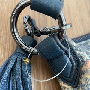 Aimee Kestenberg coated vegan leather boho batik pattern single top handle boho style purse bag. The top handle and tassel are dark blue. Branded interior lining, handle rings and zipper pull. Zip closure. Interior zipper pocket and pouch pockets. Two pouch pockets on the inside exterior. The bag itself measures approximately 12 inches wide by 11 inches tall with a 6 inch strap drop