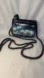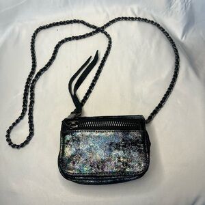 Aimee Kestenberg Down Under Mini Crossbody Iridescent Black. Black oil slick metallic coloring. Snap flap closure. Flap pocket interior. Metal chain strap. Zipper on the back.