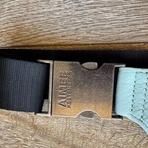 The Milan Belt Bum Bag from Aimee Kestenberg is constructed aqua blue green genuine leather with nylon fabric lining. It features a brushed silver tone logo embossed clip closure, black nylon woven fabric adjustable belt strap, brushed silver tone top zipper closure, oversized zipper pull with denim fringe, back magnetic closure slip pocket(, interior zipper pocket and. an envelope with a pleat design. This is sporty, mermaidcore,festival, travel, handsfree Vibes.