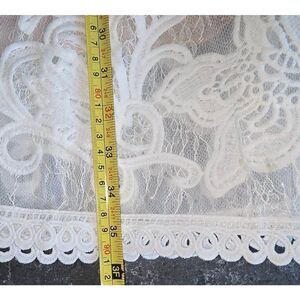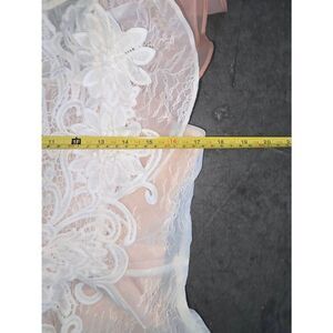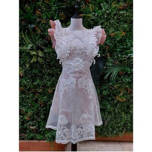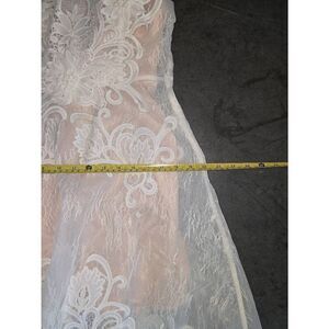 Applique lace dress has ruffled sleeves zipped back and blush pink full lining measurements in photo