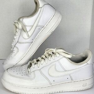 NIKE men's Air Force 1 triple white athletic sneakers pre-owned no signs of scuff marks or scratches insoles clean and sanitizer, outsoles in excellent condition, size 9.5, smoke-free home. (B)