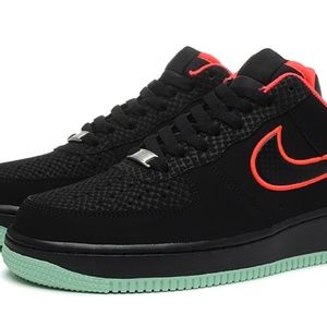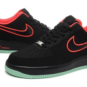 Previously loved and lightly worn, normal wear and tear. Featuring a black-based nubuck upper with a carbon fiber Swoosh embroidered in crimson, with a crimson sockliner and arctic green outsole. Inspired by the Yeezy colorway is this new Nike Air Force 1 Low edition. Featuring a Black... Air Force 1 Low Black/Laser Crimson-Arctic Green. One of four colorways of the Nike Air Force 1 Low set.