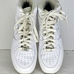 NIKE men's Air Force 1 high-top triple white athletic sneakers pre-owned no signs of scuff marks or scratches, insoles clean and sanitizer, outsoles in excellent condition, missing strap on right side, size 8.5, smoke-free home, or the best offer.