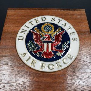 This vintage Air Force tissue box cover is crafted from solid wood and features a beautifully enameled metal badge representing the United States Air Force. Keep your tissues stylishly organized while paying tribute to our nation's armed forces. A tasteful addition to any room.