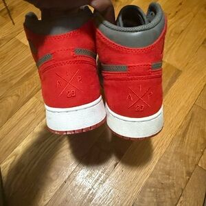 Stylish Nike high-top sneakers. Gray leather and red suede accents. Padded collar for support. Durable rubber outsole. Sporty streetwear appeal.
