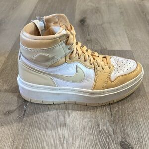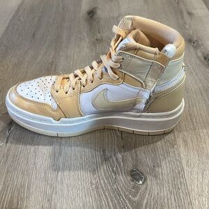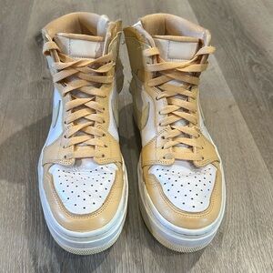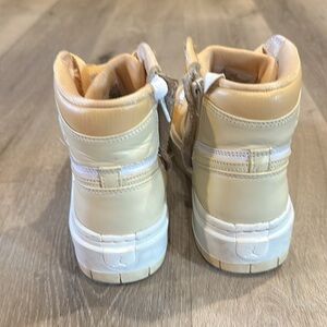 Platform Jordans in celestial gold/white/sail/muslin with a side zipper.