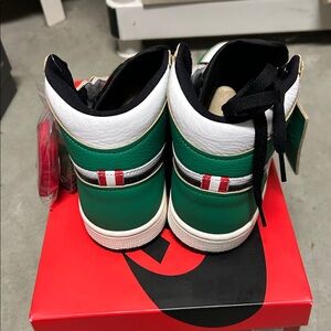 Women’s Air Jordan 1 Nike high-top sneakers with a striking black, green, and white color scheme. Features bold design elements. Brand new! Comes with box