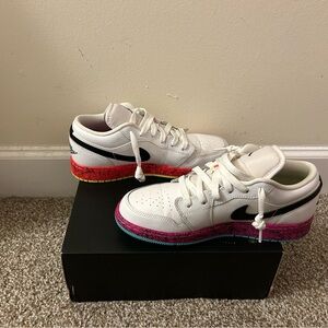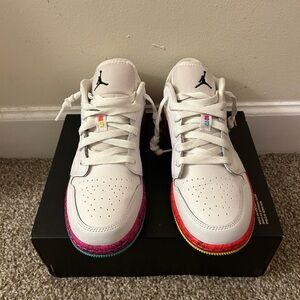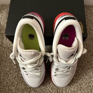 Nike Air Jordan size 5Y. Classic white and black design with vibrant accents. In excellent condition. Box is missing lid.