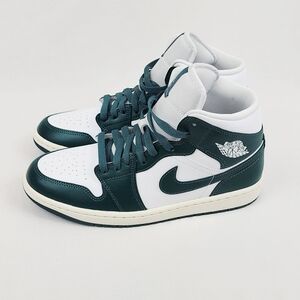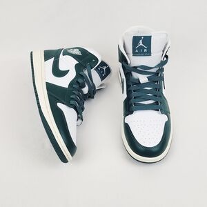 Stylish Air Jordan 1 Mid sneakers in green and white. Perfect for casual wear.