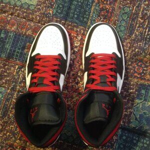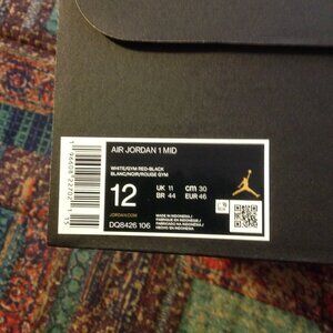 Up for sale is a brand new in the box pair of men's Air Jordan 1 mid black, white & red leather sneakers, USA size 12 - Style # DQ8426-106. I only ship to USA.