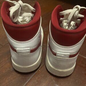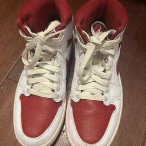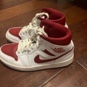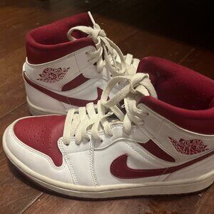 Women's Nike Air Jordans 1 Mid Red, bought in 2022 for $120. Stored in closet. Lightly used but has a few scuffs. The shoe is size 6 in womens. Nike box not included in shipment.