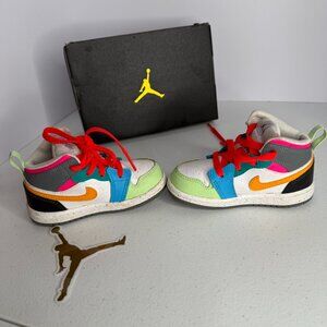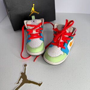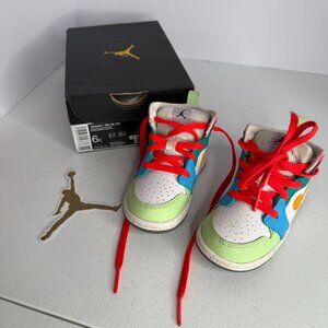 Bright and bold little pair of Air Jordan 1 Mid SE sneakers in toddler size 6C. They’ve got a fun mix of colors—green, blue, orange, and red—with the classic Jordan logo. Lightly worn and still in great shape. Original box included.