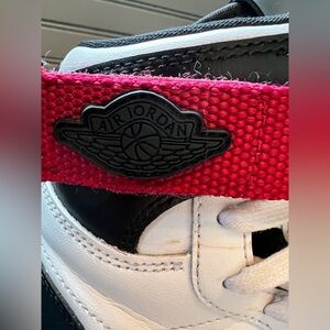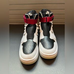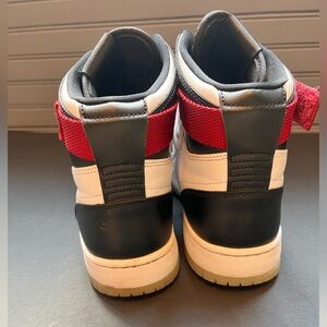 Stylish Jordan sneakers for women. Features black and white leather with red accents. High-top design with secure strap.