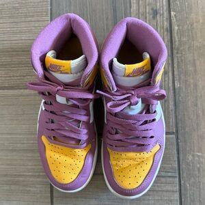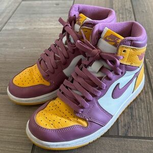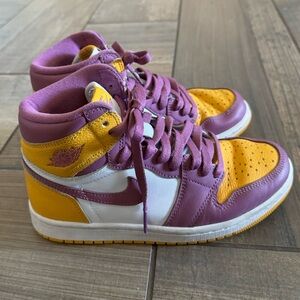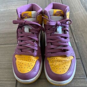 Air Jordan 1 Retro High OG ‘Brotherhood’ size 5. Gently used and in good condition. The Air Jordan 1 Retro High OG 'Brotherhood' features a vibrant color scheme inspired by Omega Psi Phi, the fraternity that Michael Jordan joined as a student at the University of North Carolina. The upper combines a white leather quarter panel with nubuck overlays in Light Bordeaux. A leather toe box in University Gold is matched by wraparound leather overlays at the collar and heel. A leather Nike Air tag decorates the nylon tongue, while a classic Wings logo is stamped on the lateral ankle. Supporting the high-top is a rubber cupsole with an Air-sole heel unit encapsulated in lightweight polyurethane.