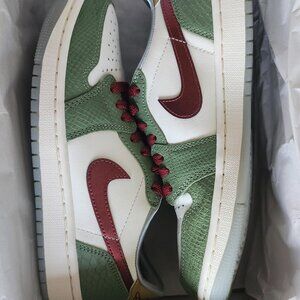 This Air Jordan 1 Retro Low OG ‘Year of the Dragon’ pays homage to the Year of the Dragon Chinese New Year with an off-white leather upper and scaled green nubuck overlays at the heel and forefoot. The inside of the tongue tag shows a Jumpman intertwined with a dragon. The laces have dark crimson accents while an off-white midsole and see through rubber outsole complete the look.
