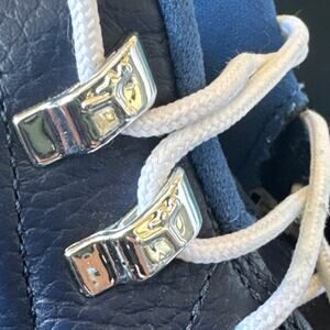 The 2012 Obsidian version of the Jordan 12 Retro features an upper of Obsidian Blue textured leather, stitched in a pattern meant to evoke the Rising Sun Japanese flag. An overlay of textured white leather graces the lateral side of the shoe. The white laces cross over an Obsidian Blue tongue with a blue Jumpman logo and "Two 3" branding. Other features of the upper include Metallic Silver lace loops near the uppermost eyestays, a blue heel tab with a Jumpman logo and "JORDAN" branding, "23" on the heel, and "JUMPMAN" debossed on the white leather overlay. The white midsole features Air cushioning, and the white rubber outsole has Obsidian Blue pods with herringbone traction and a French Blue hit with "23."