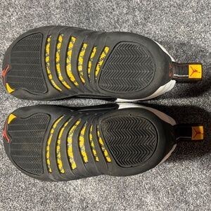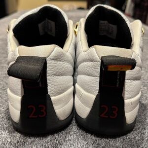 These are Air Jordan 12 Retro Sneakers featuring a classic design with a white and black color way. The shoes are known for their comfortable fit and classic style.