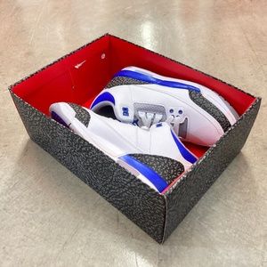“This edition of Nike’s Jordan 3 Retro “Racer Blue” comes constructed in full leather, featuring a palette of white, blue, and cement. Grade School (GS) sizing is similar to the main men’s model, but offered at a slight discount!”