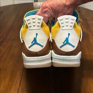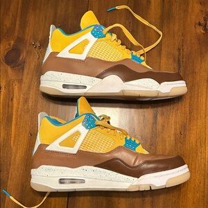 Custom painted Air Jordan 4 Shimmer in two shades of brown and gold. Trimmed in mellow blue with custom splatter. Will fit Men size 9.