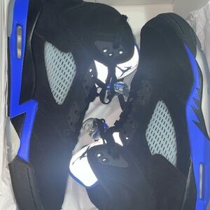 Elevate your style with Air Jordan 5. Sleek black design with striking blue accents.