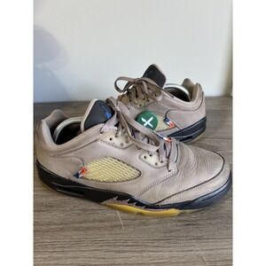 The Air Jordan 5 Retro Low Paris Saint-Germain Paname Nike in Gray is a stylish and comfortable sneaker perfect for both activewear and casual occasions. Featuring a low top design, lace-up closure, and cushioned outsole, this shoe offers a snug fit for basketball performance or everyday wear. The suede upper material and rubber outsole provide durability and a trendy look, with the iconic Jordan brand and exclusive Paris theme adding a touch of flair. This 2022 release is a must-have for sneaker enthusiasts looking for a versatile and fashionable addition to their collection.