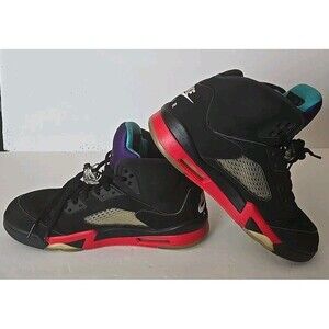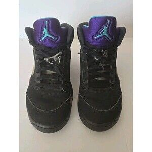 The Air Jordan 5 Retro Top 3 Fire Red Metallic Grape in size US Mens 10 is a stylish sneaker featuring a lace-up closure and a mid-top shoe shaft.