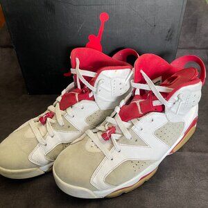 These are Air Jordan 6 retro's in men's US size 10.5. They are worn but in great shape and comes with the original box. The style code is 384664-113 which is the "alternate hare" release. Great addition for those air jordan collectors.