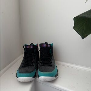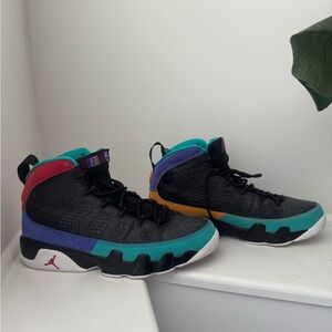 Jordan 9 Retro – Men’s Size 10. multicolor design with bold teal, purple, red, and gold accents. Lightly worn, excellent condition.
