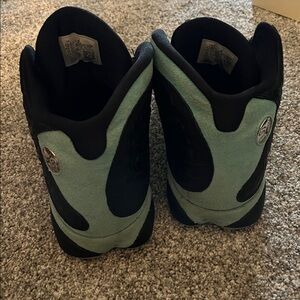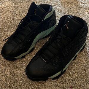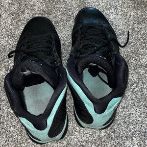 Stylish Air Jordan sneakers in black with teal accents. Perfect for casual wear.