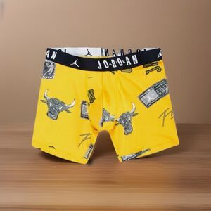 The Air Jordan Boxer Briefs Jumpman Flight 2 Pack in Mens Size Medium features a colorful design in yellow, blue, and black. These boxer briefs are made of soft, breathable cotton stretch jersey for a comfortable fit. The elastic waistband provides a secure and comfortable fit, while the closed pouch offers support. The stylish design and quality material make these boxer briefs a great choice for sports enthusiasts or those looking for a vibrant underwear option. Perfect for everyday wear or for showing off your personal style.