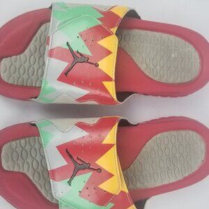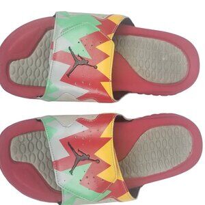 Air Jordan Hydro 7 retro sports slippers. Gray, red green, yellow. Youth size 7. Some wear to insole, right toe and soles but otherwise in good pre-owned condition.