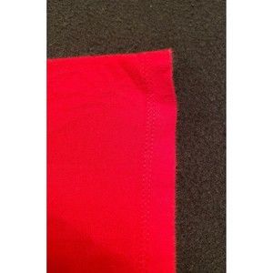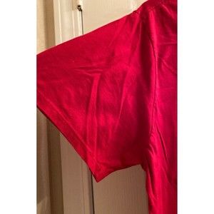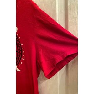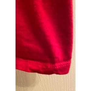 The back of the garment is solid red except at the top of the shoulder that sports a smaller graphic.